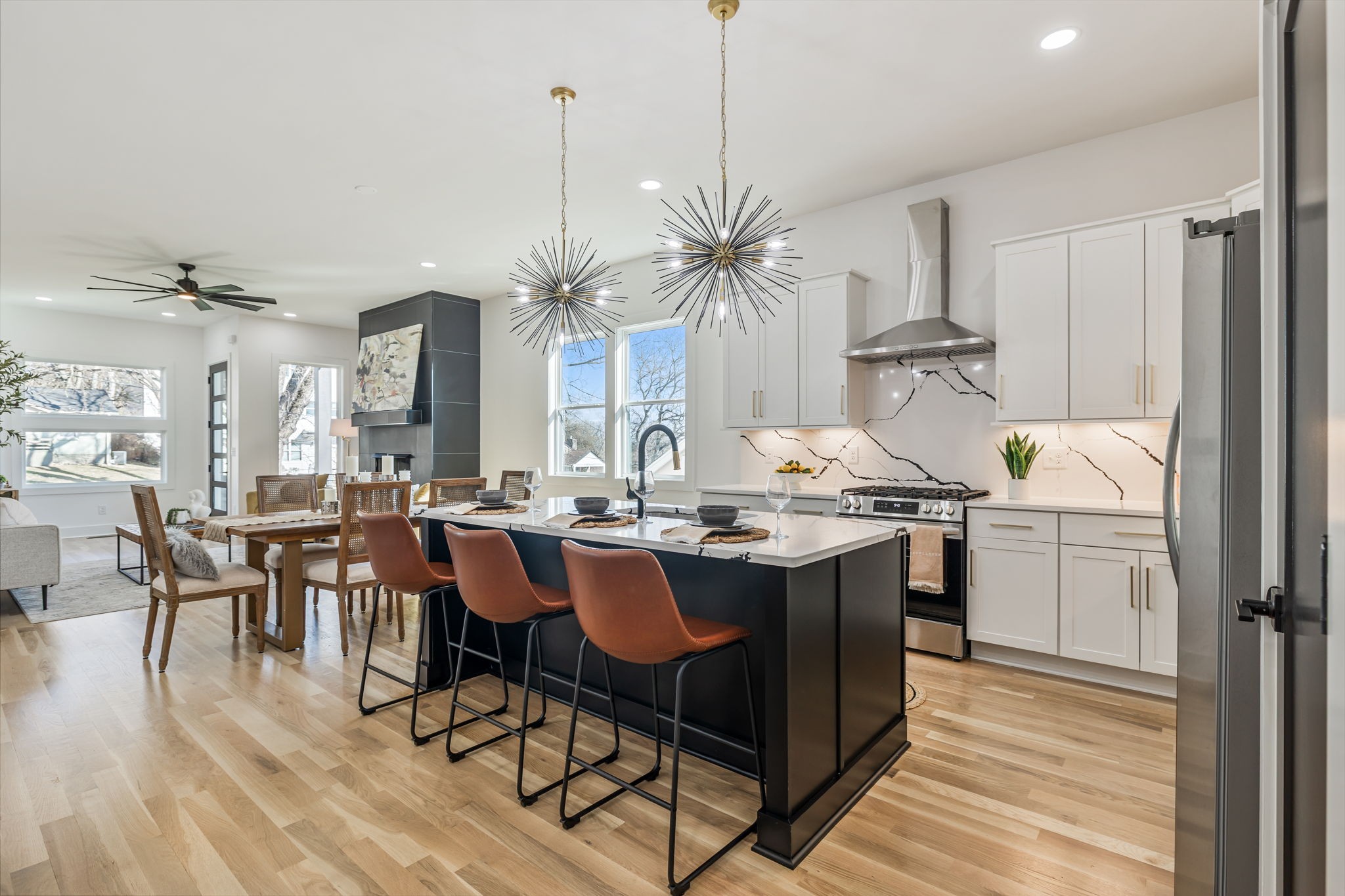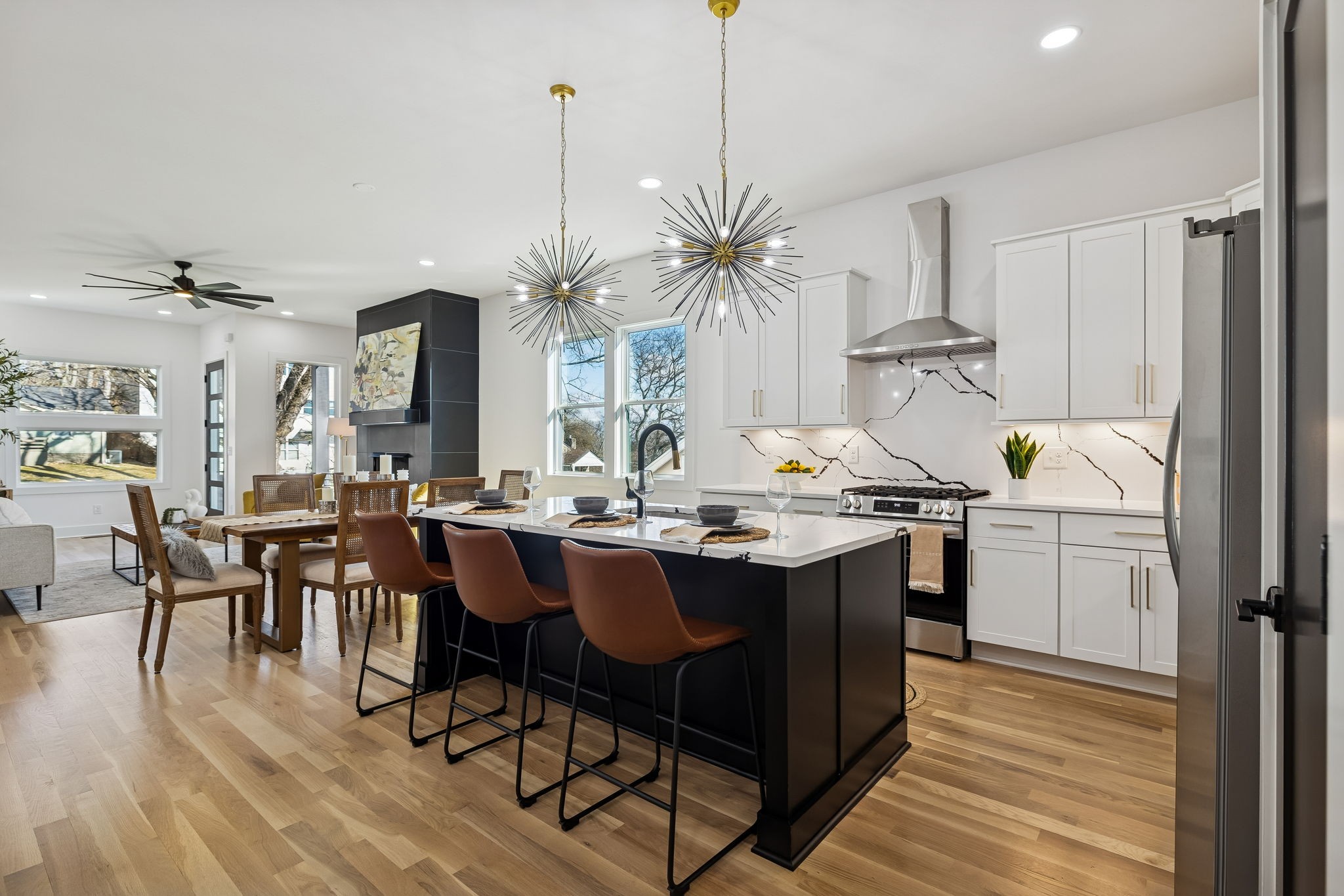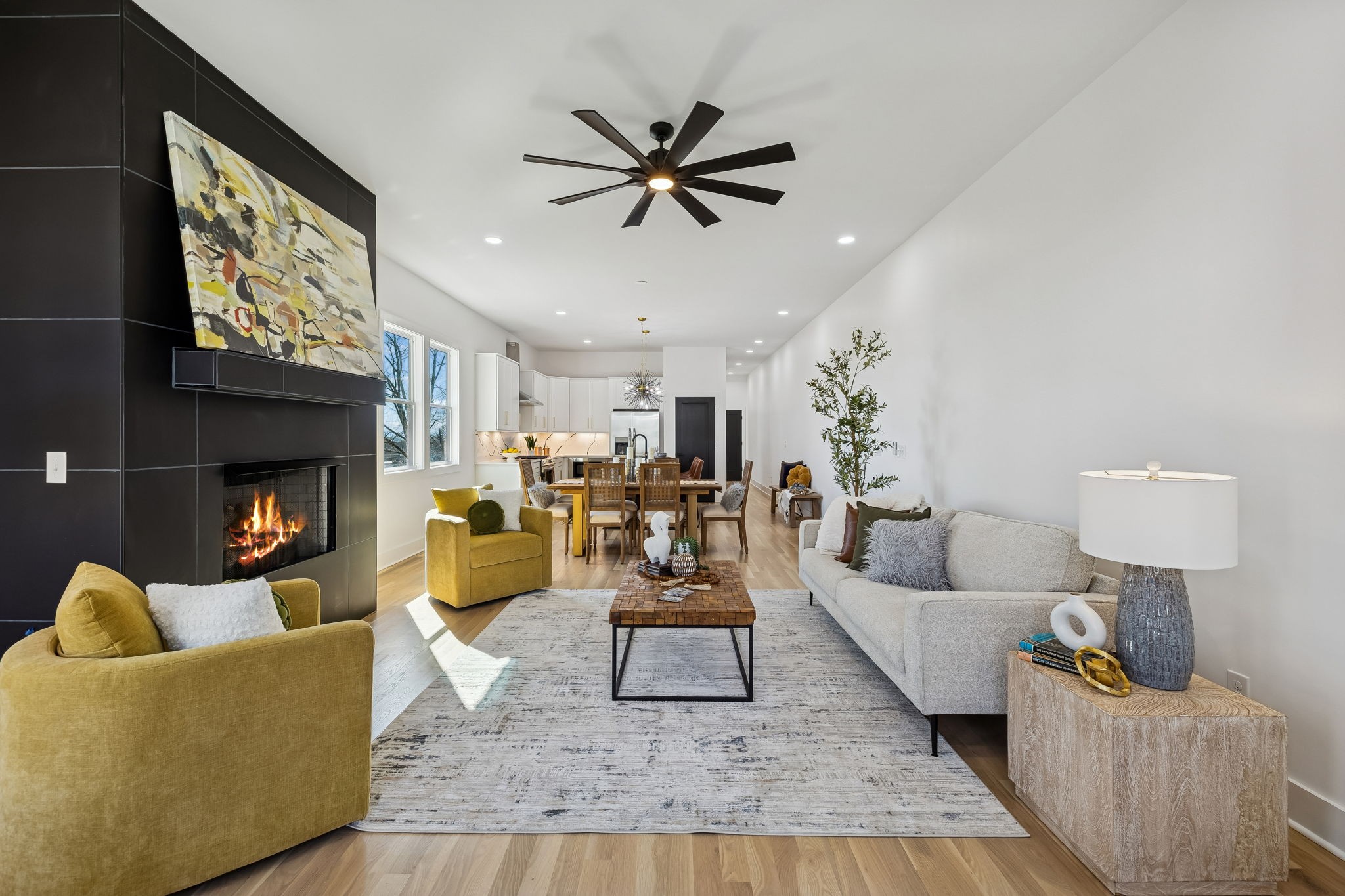 Inside, you’ll find wide-plank hardwoods, soaring ceilings, and an open-concept layout filled with natural light. The kitchen is a true statement with quartz countertops, a large island, gas range, stainless appliances, and bold designer lighting that adds a high-end touch. The living space is anchored by a sleek floor-to-ceiling modern fireplace, creating the perfect setting for entertaining or cozy nights in. Throughout the home, statement fandeliers and curated lighting selections elevate the overall aesthetic and bring a polished, designer feel to every space.