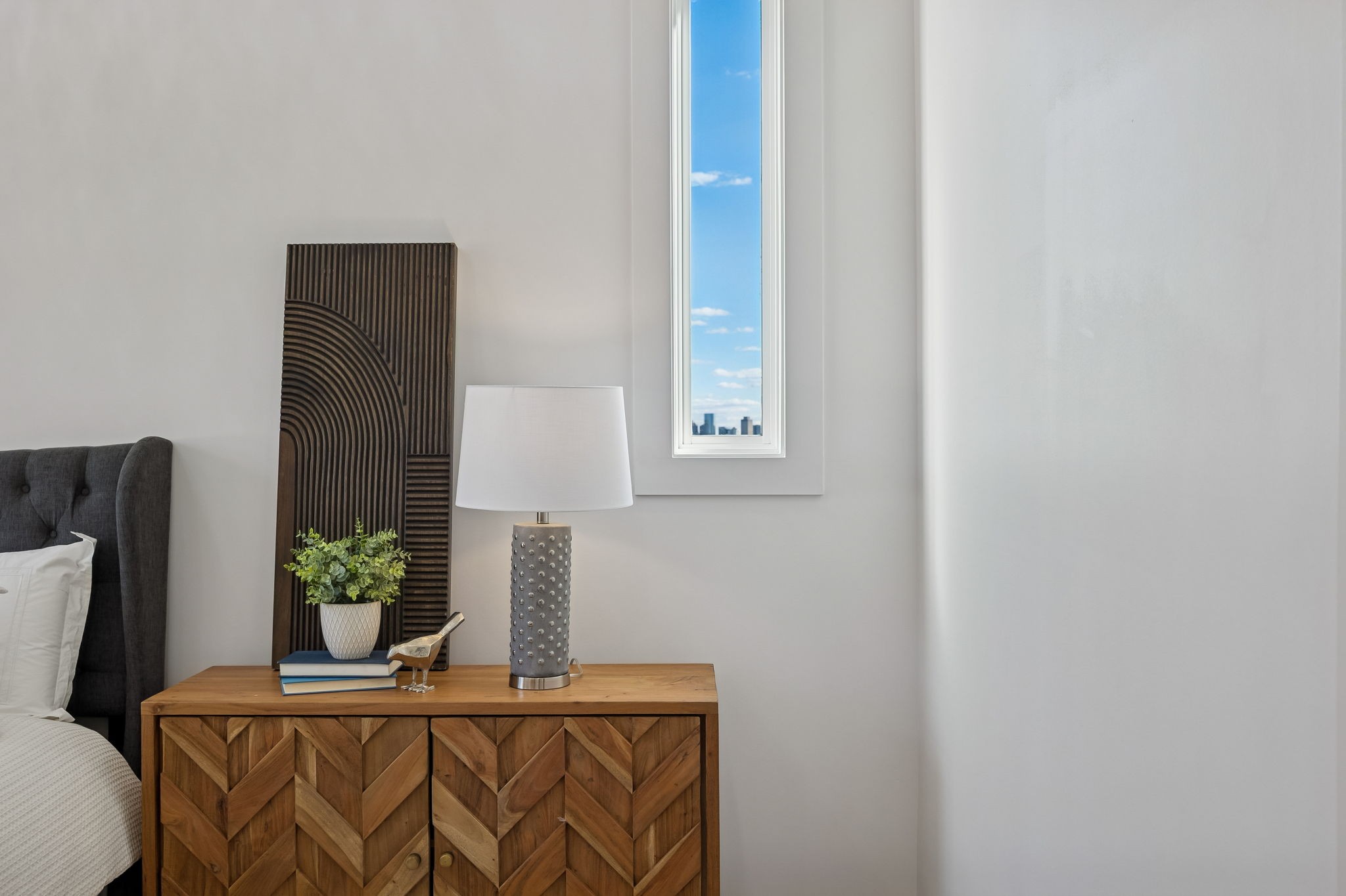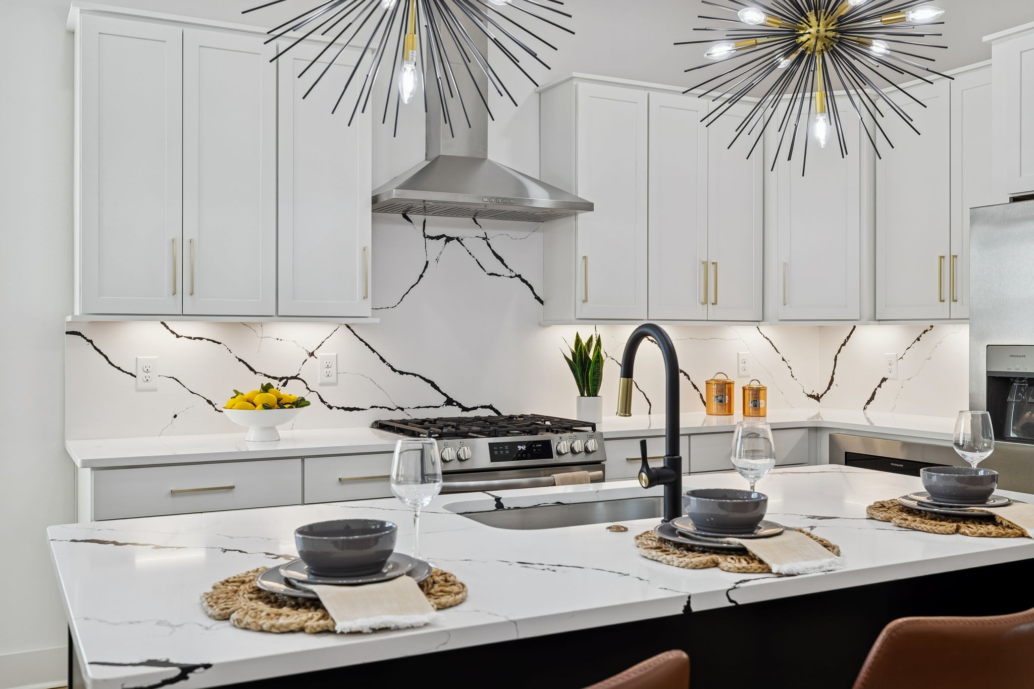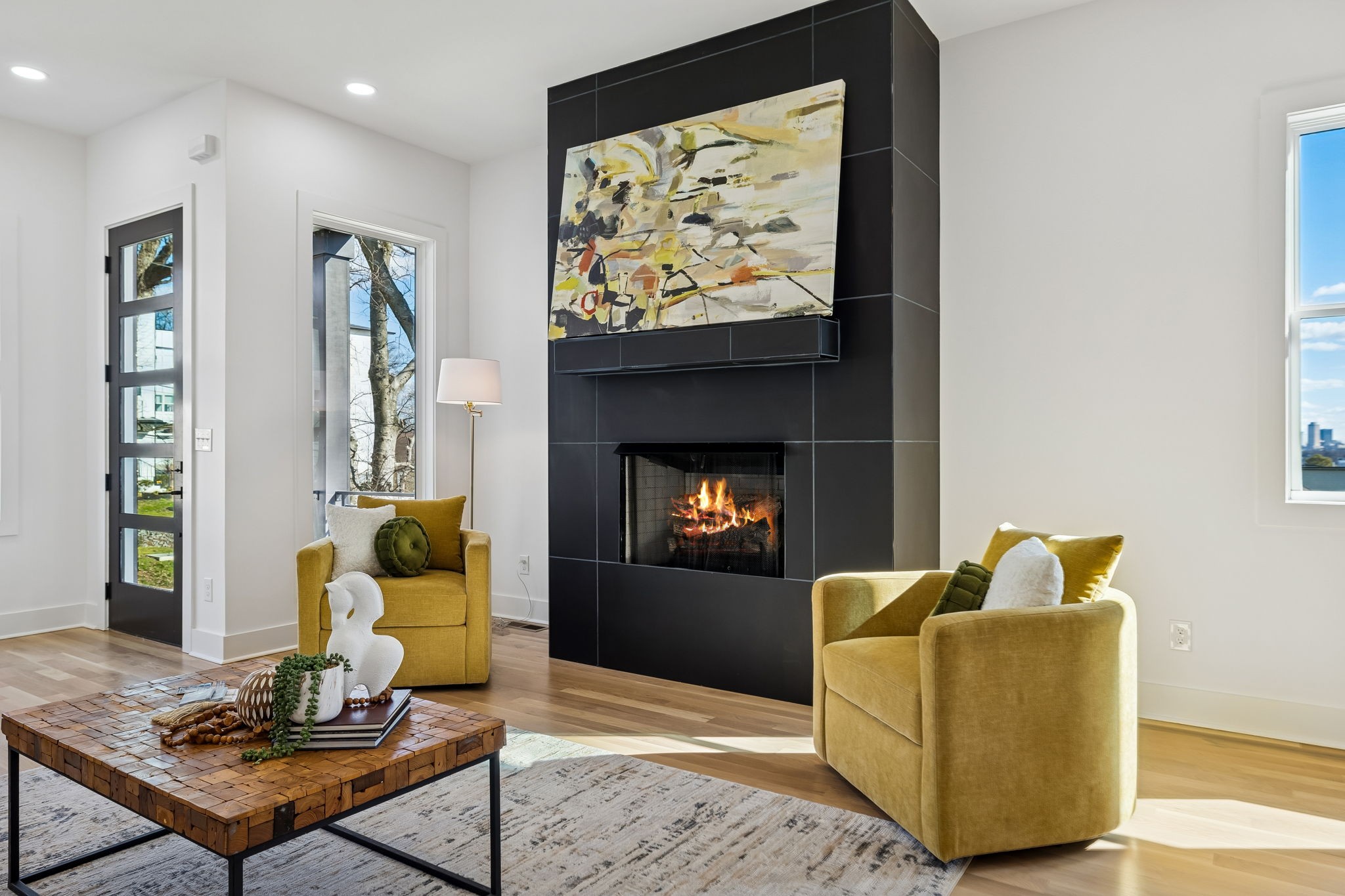 Inside, you’ll find wide-plank hardwoods, soaring ceilings, and an open-concept layout filled with natural light. The kitchen is a true statement with quartz countertops, a large island, gas range, stainless appliances, and bold designer lighting that adds a high-end touch. The living space is anchored by a sleek floor-to-ceiling modern fireplace, creating the perfect setting for entertaining or cozy nights in. Throughout the home, statement fandeliers and curated lighting selections elevate the overall aesthetic and bring a polished, designer feel to every space.